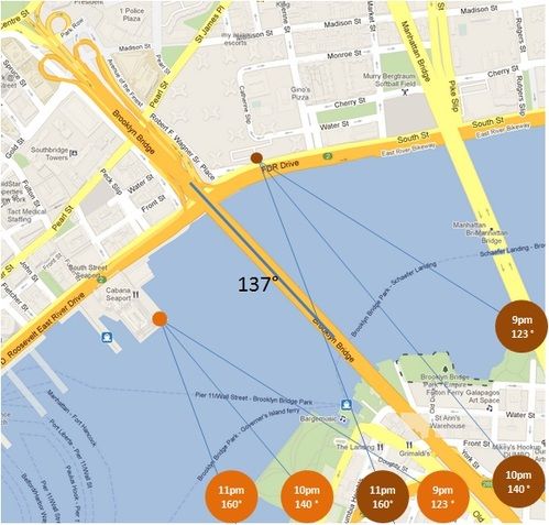 The exercise was not easy. As the moon was rising up over the buildings; we had to be at the right place at the right time! We spent a lot of time discussing about the itinerary. What was the best place to photograph the Harvest Moon? At what time was the moon at its zenith? Through our calculations, we also noticed that the moon could be perfectly aligned with the Brooklyn Bridge.